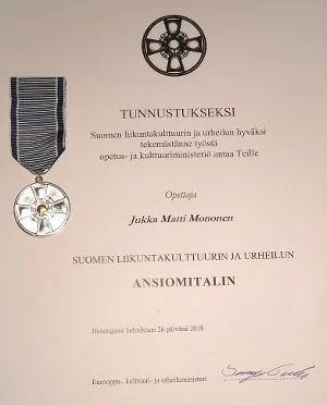 Suomen liikuntakulttuurin ja urheilun ansiomitalin.