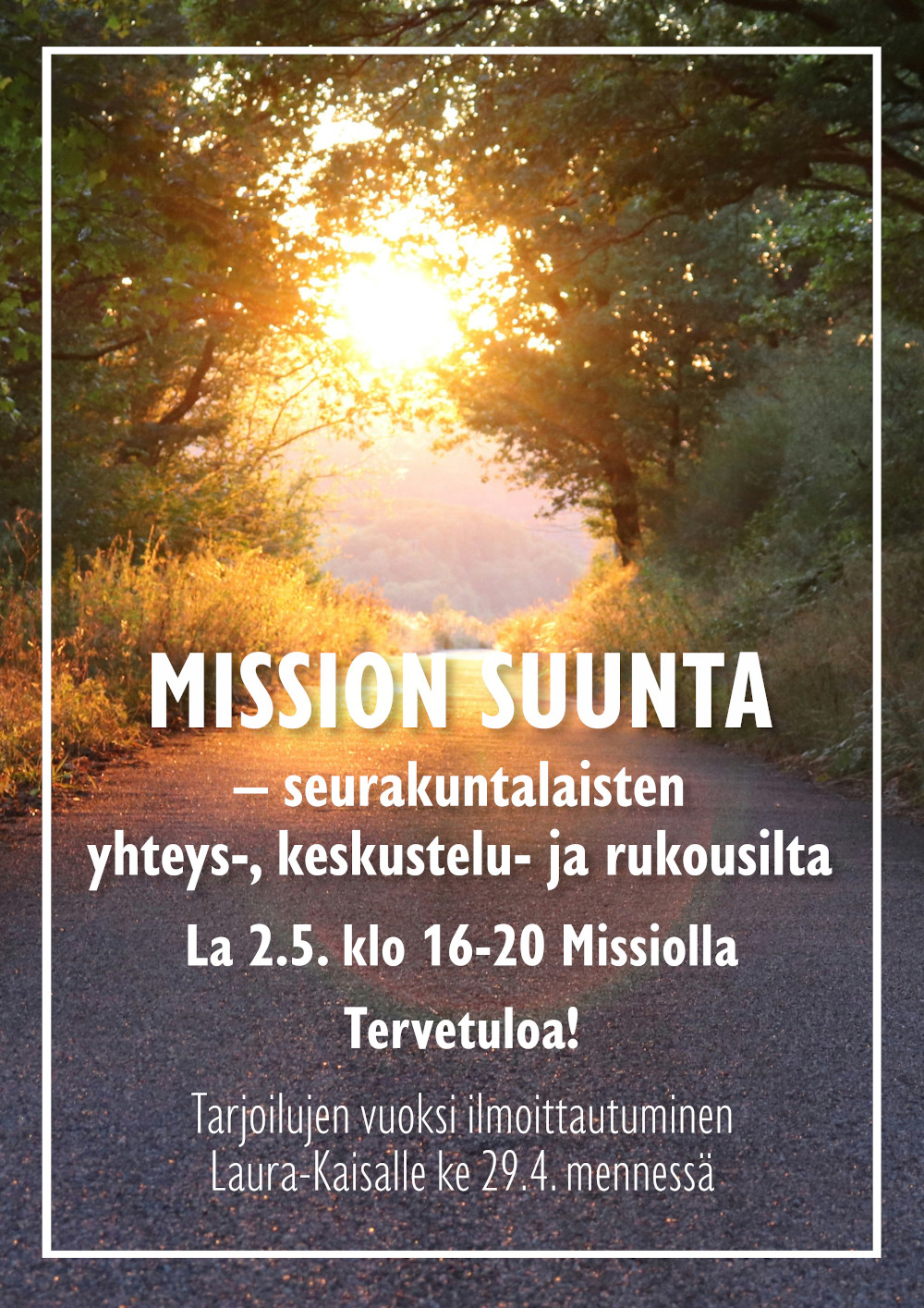 Tarjoilujen vuoksi ilmoitathan tulostasi viimeistään ke 29.4. toimistolle: toimisto@missiochurch.fi / puh. 044 035 3588